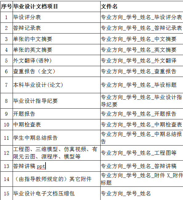 (2)员工需提交15份数字化资料(其中毕业设计论文需含word和pdf两个版本),所有电子资料放一个文件夹内,文件夹以“专业方向_学号_姓名”命名,压缩后提交指导教师。