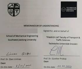 1.中德合作工作组副组长唐阳2020年2月再次赴德,与德累斯顿工大交通学院、IFB铁路技术公司、IPASS教育咨询公司、DPFA教育集团、萨克森硅谷等进行了系列会谈,取得实质性进展。5月草拟了与TUD合作MOU及协议,10月组织了两校视频会议,12月签订了两校合作MOU。